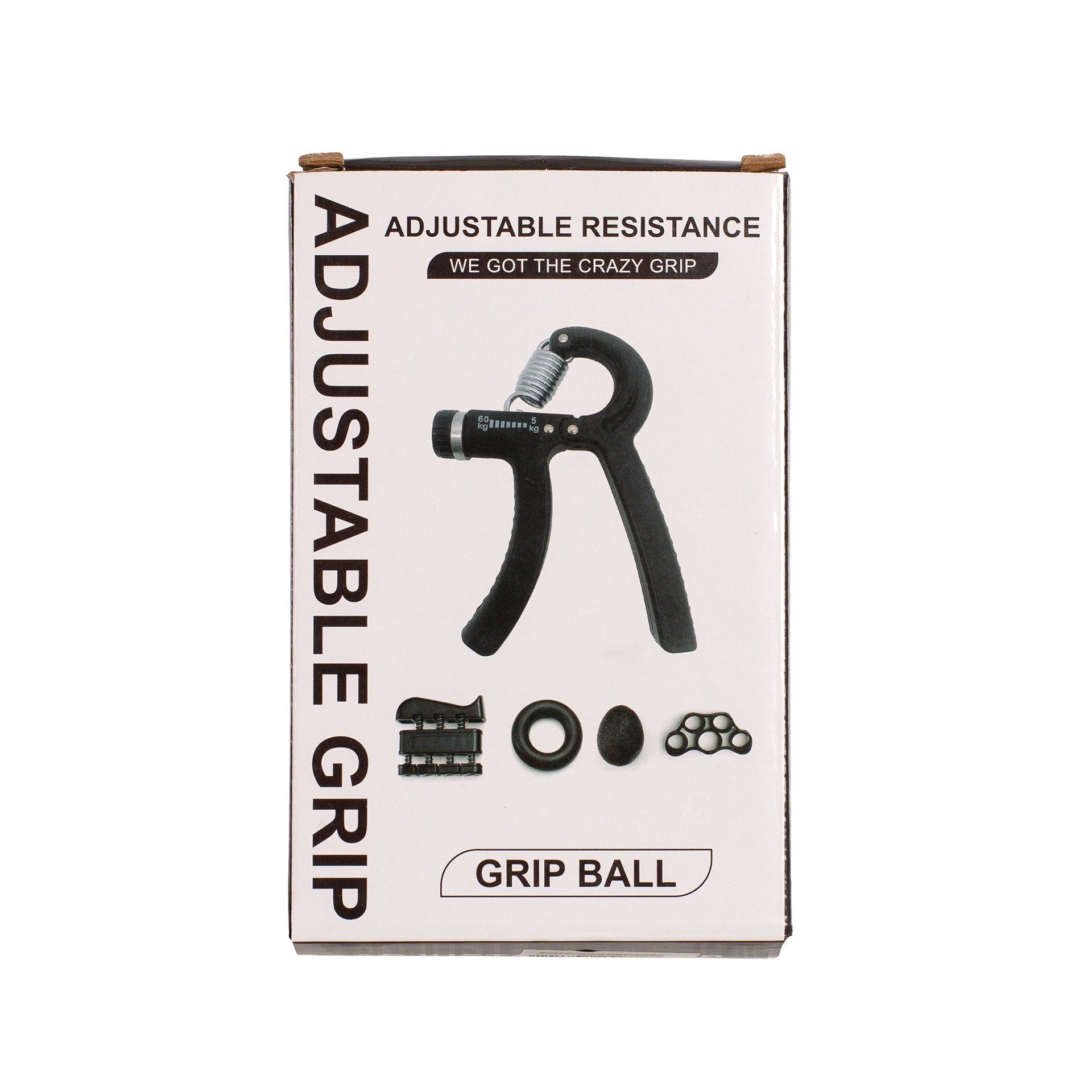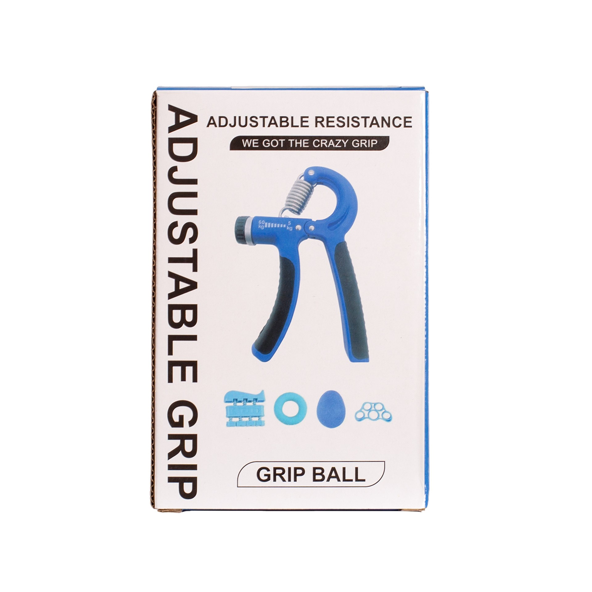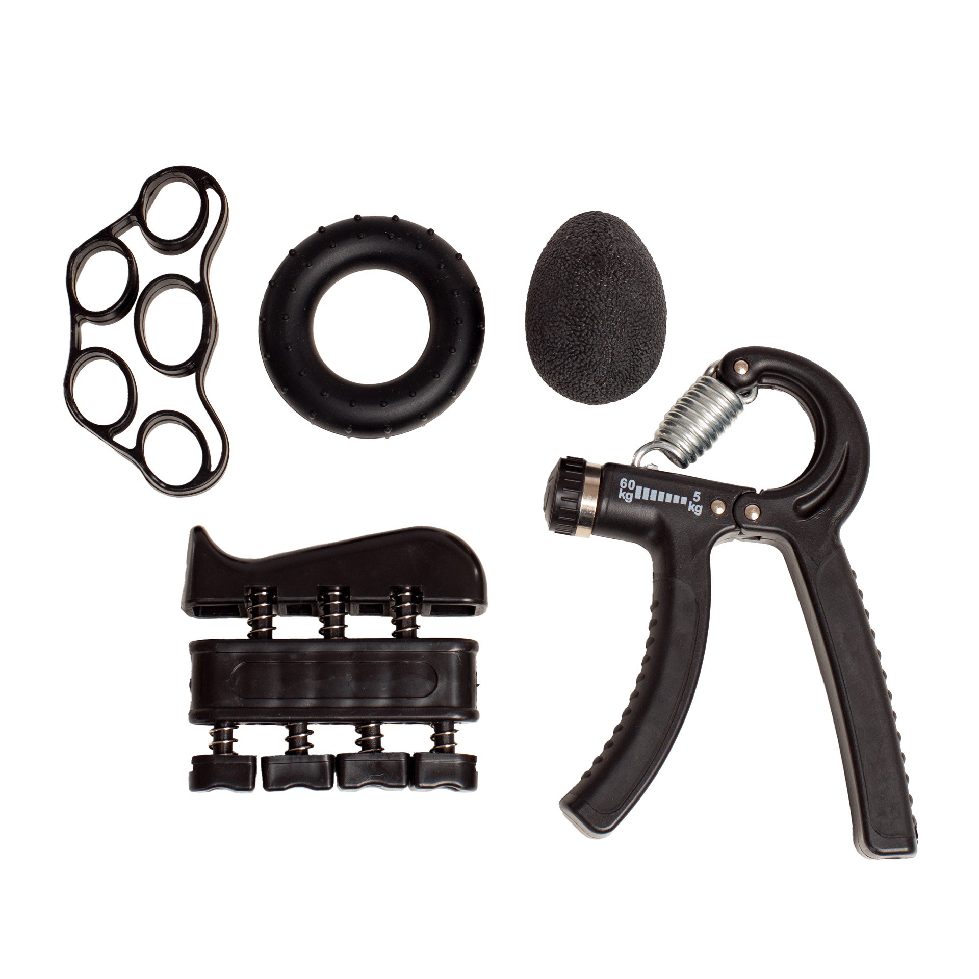 Incluye una empuñadura de agarre ajustable (5-60kg), un ejercitador de dedos, un anillo de agarre, una bola antiestrés y ejercitador de dedos con banda elástica.