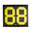 Marcador de mesa multideporte piramidal plegable. Numeración doble de 0 a 99 en tarjetas grandes (17,5×7,5cm) y de 0 a 9 en las pequeñas (12,5×5,5cm). Estructura en material cartón rígido recubierto en polivinilo, anillas metálicas y tarjetas en número en PVC. Medidas abierto: 50x10x20cm.