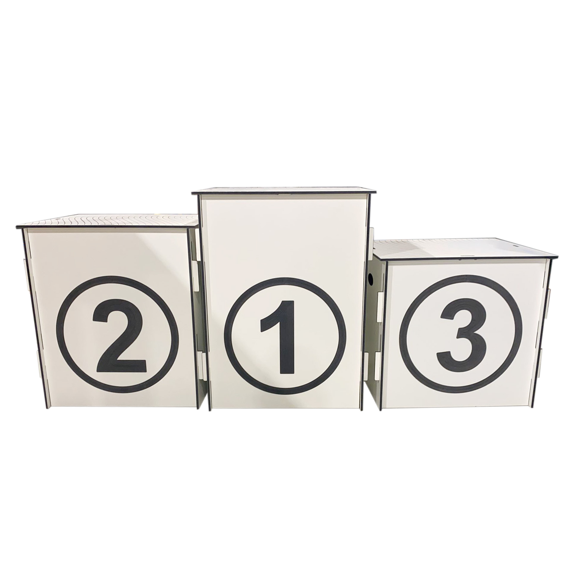 Podium de estructura fenólica de 8 mm de espesor con base rallada para evitar resbalones. Personalizados mediante grabados o fresados. Medidas de cada pieza: 50x50x50cm/60x60x60cm/ 70x70x70cm. Producción bajo pedido.